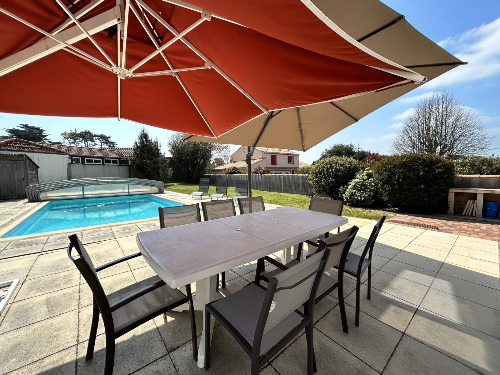 Spacieuse terrasse avec mobilier, chaises longues, parasol, barbecue charbon. Piscine avec dôme (non chauffée). Jardin clos.