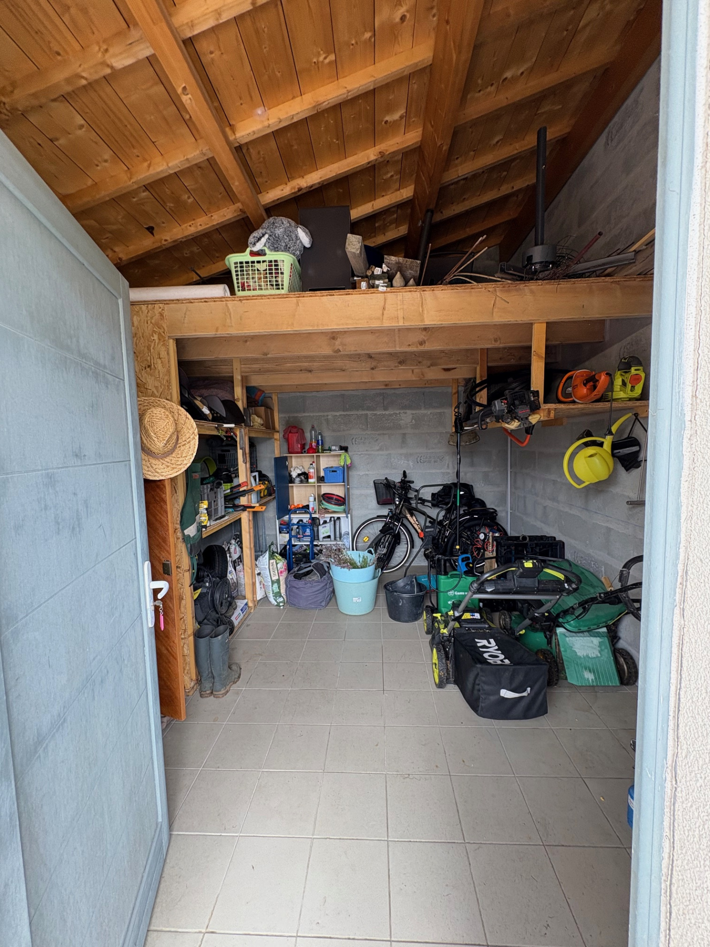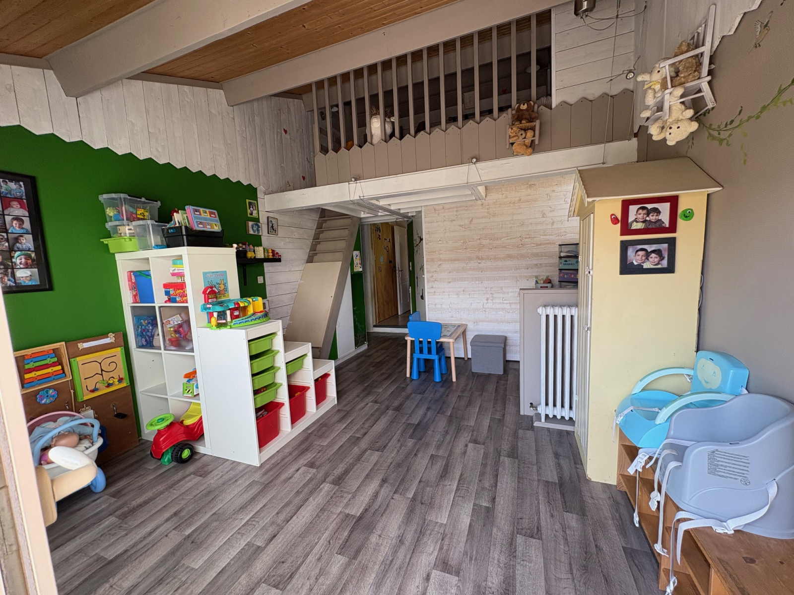 Salle de jeux avec mezzanine, chaufferie, arrière-cuisine,