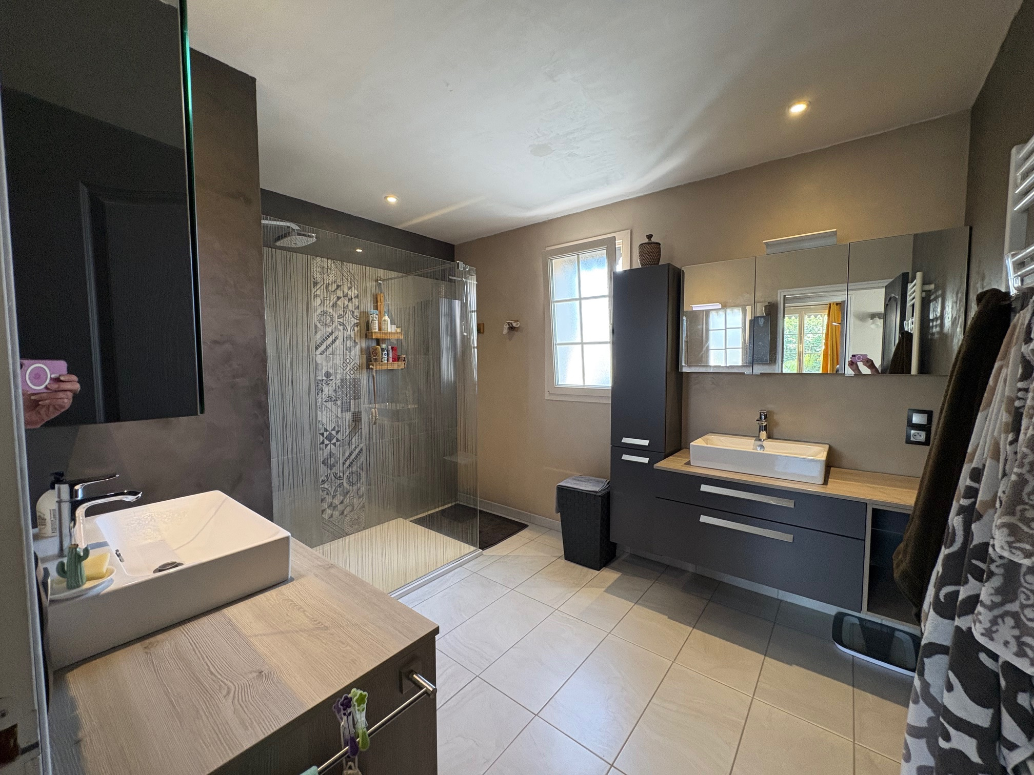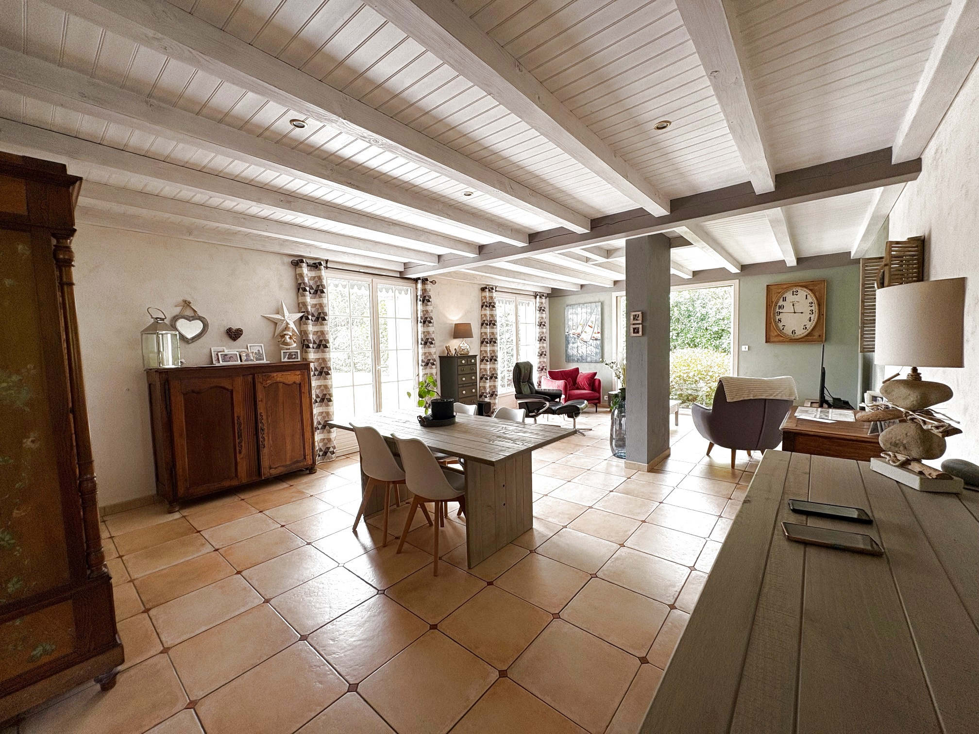 Entrée, séjour ouvrant sur terrasse abritée exposée Sud-Est,