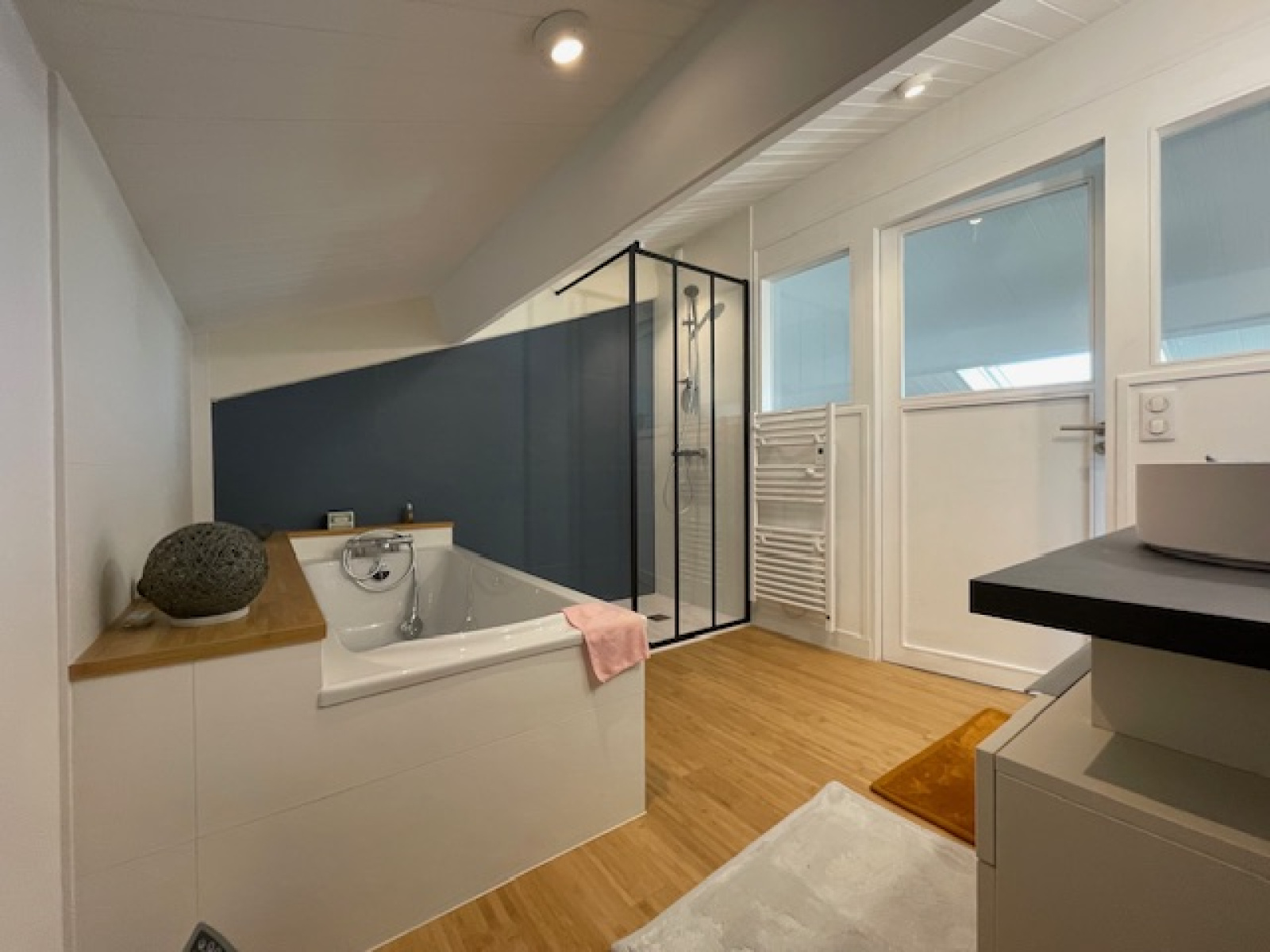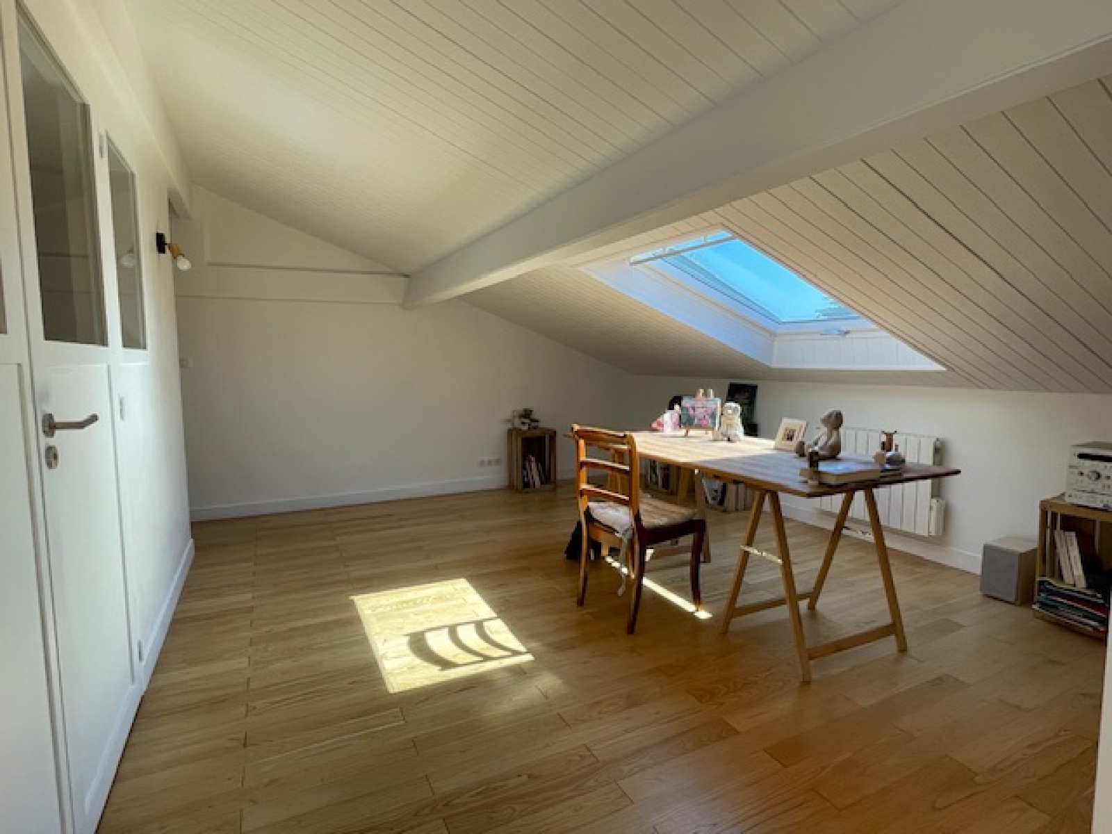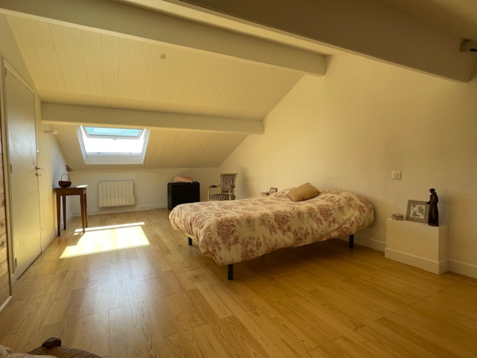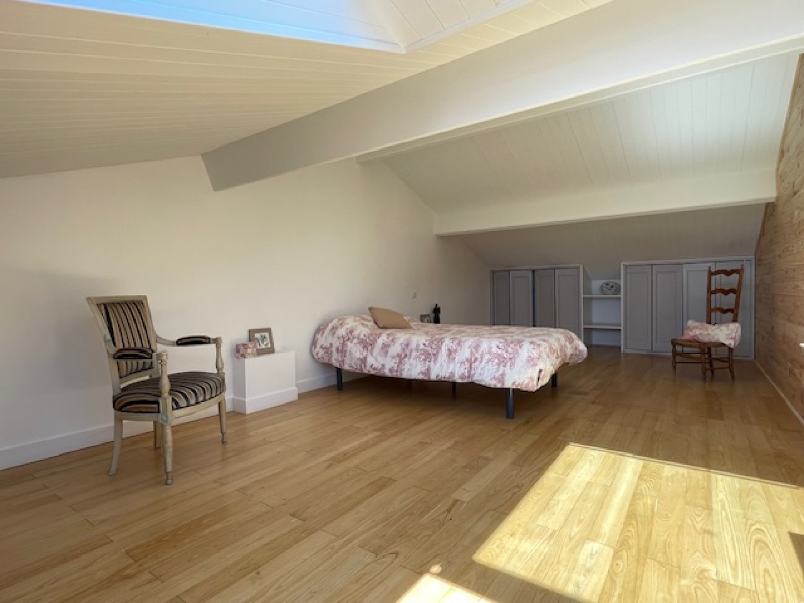 A l'étage vaste bureau sous rampants, chambre de 28 m² dévéloppés avec placards, salle de bains avec douche, wc indépendant.