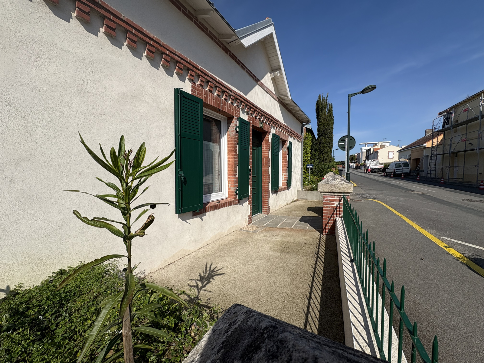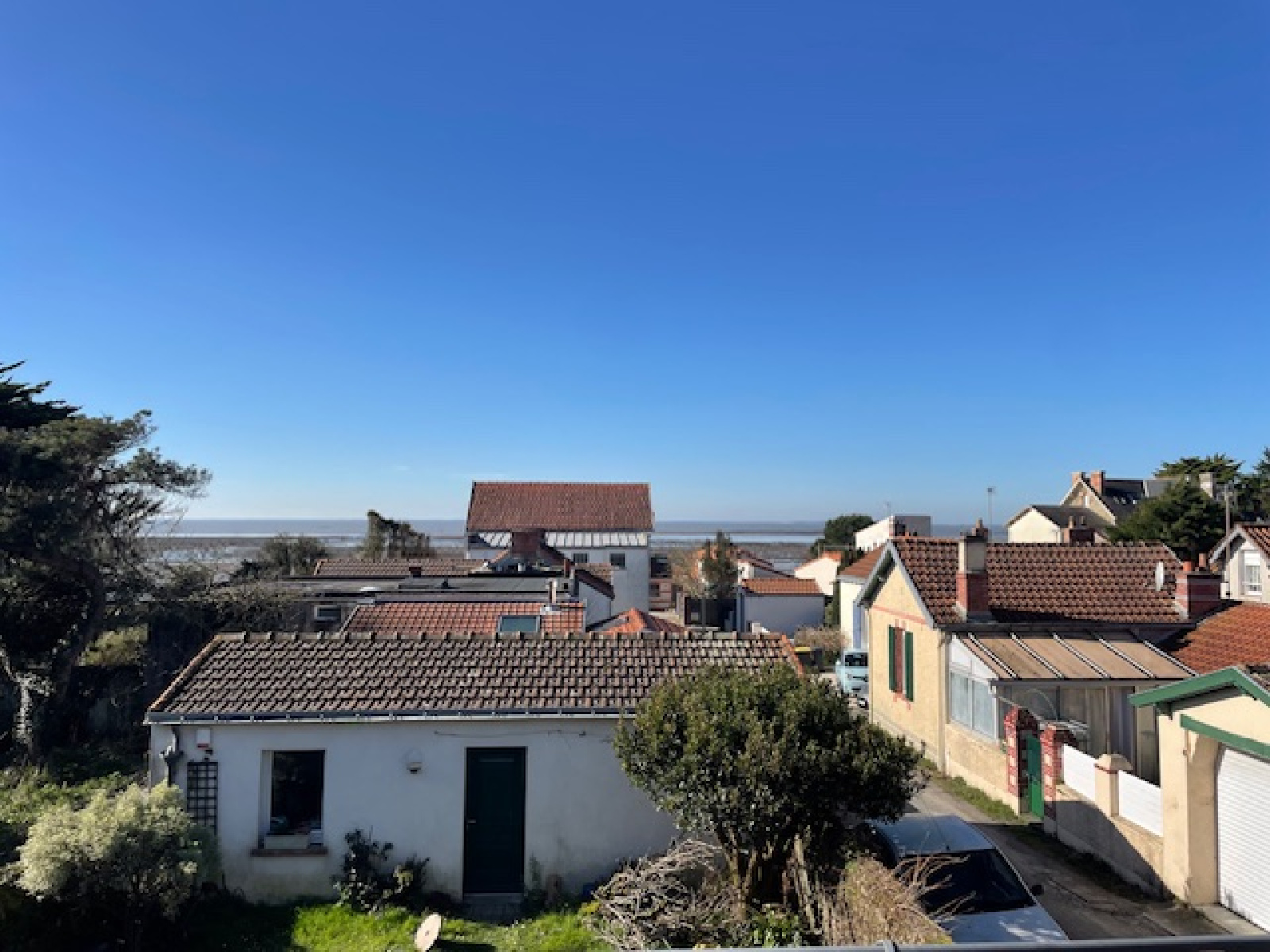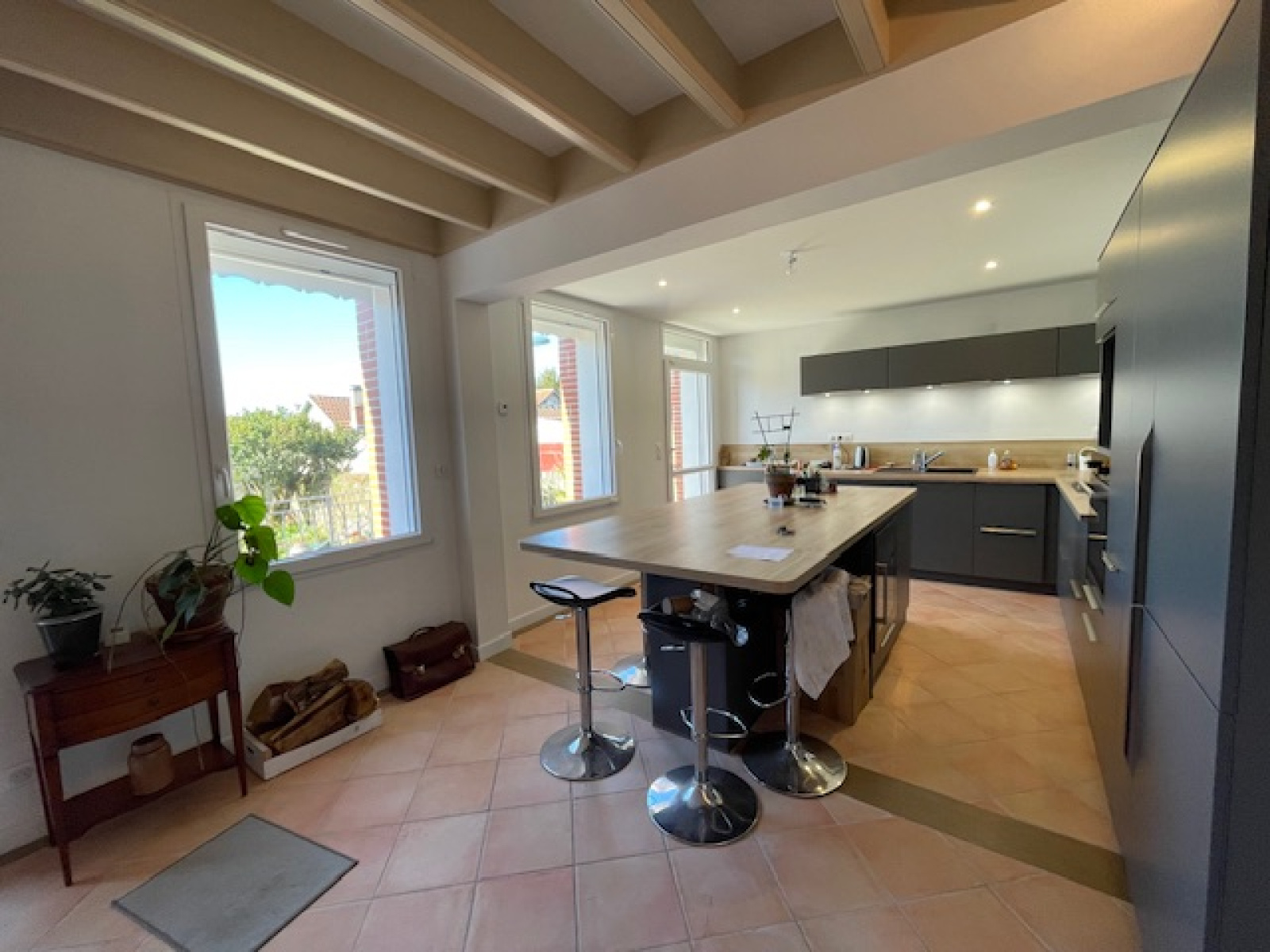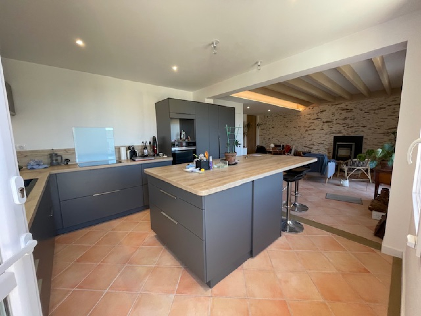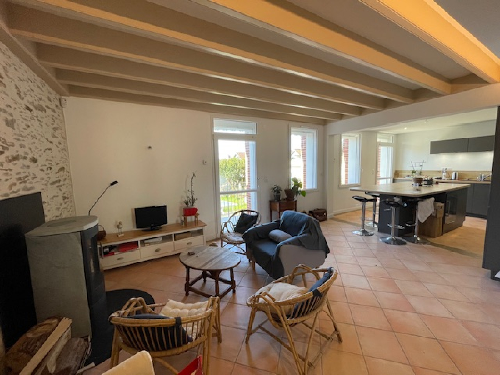 Maison de style pornicaise, rénovation totale par architecte, avec matériaux de qualité, isolée et au goût du jour, comprenant : entrée, salon-séjour avec cuisine de bonne facture le tout ouvrant sur balcon, chauffage au sol, poêle à bois.